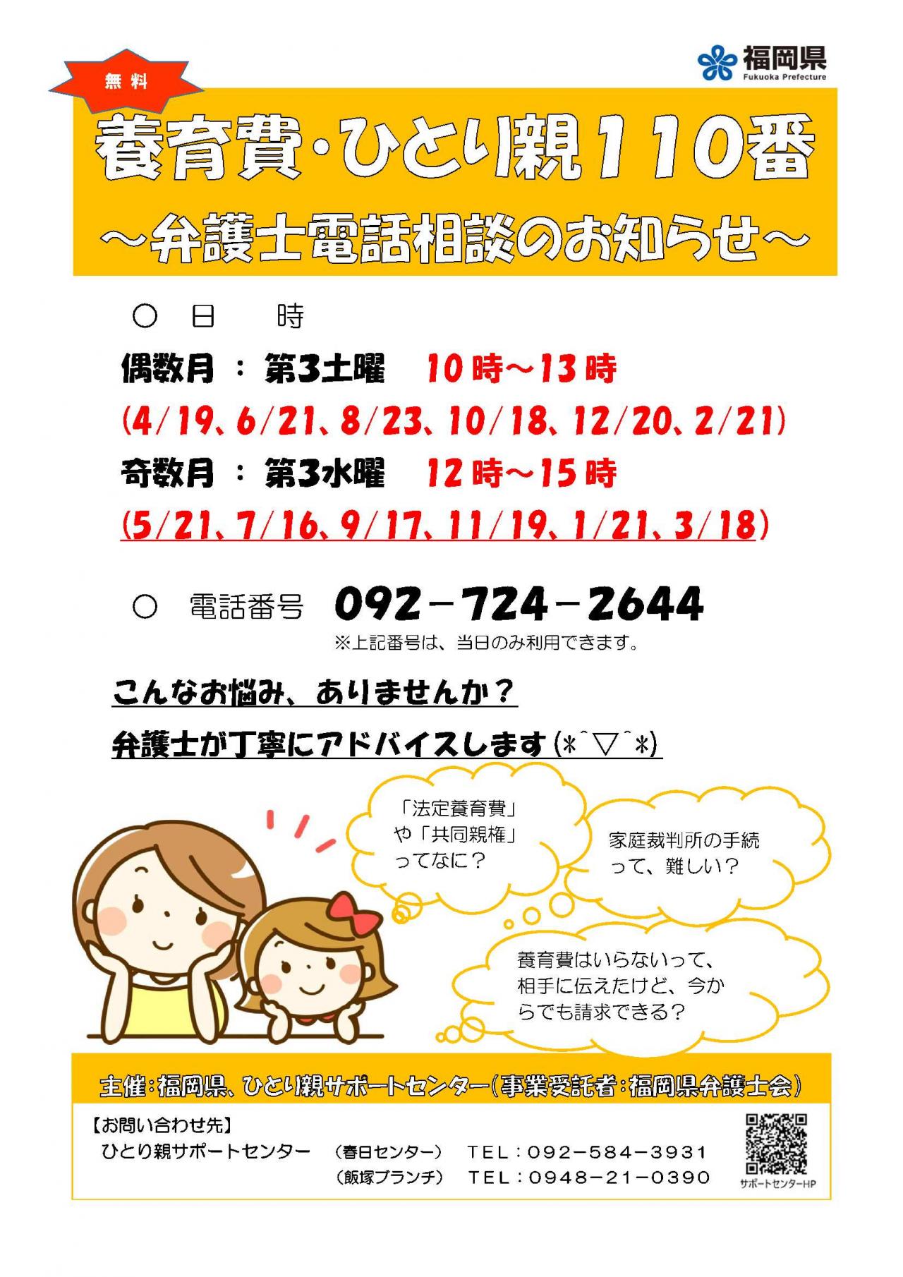福岡県ひとり親サポートセンターでは、ひとり親や離婚を考えている方からの養育費等に関する相談に対応するため、【養育費・ひとり親110番】を実施しています。