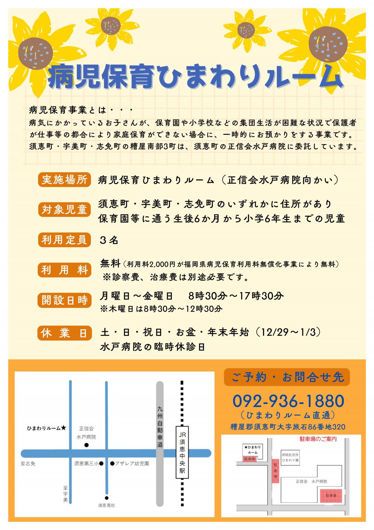 正信会水戸病院が三町(須恵町・宇美町・志免町)より委託を受けて、令和7年12月1日より病児保育「ひまわりルーム」を開設します。